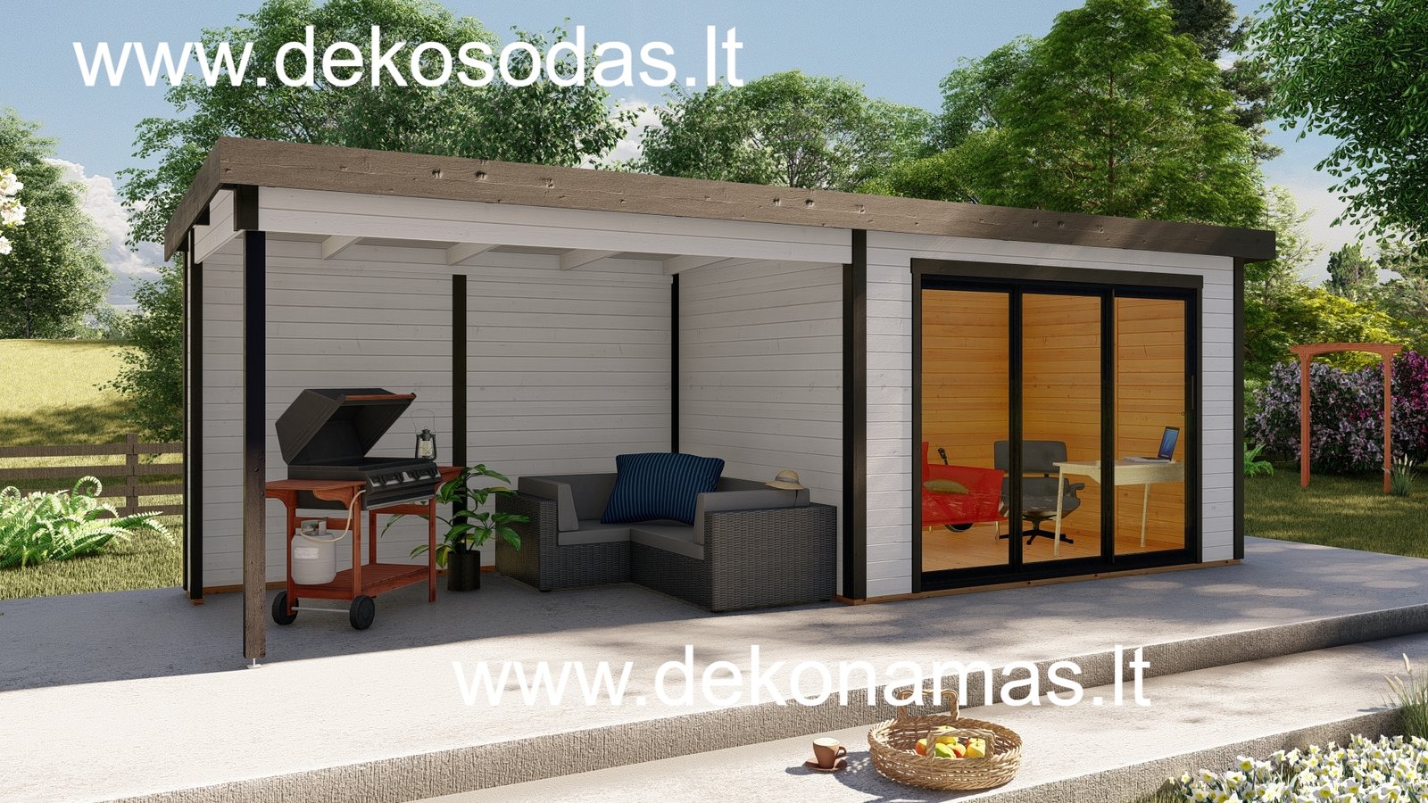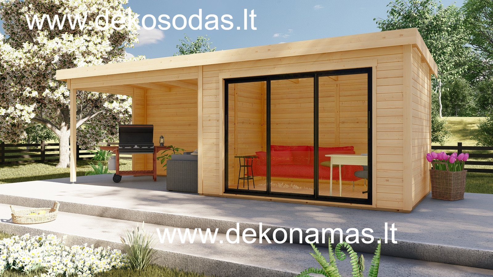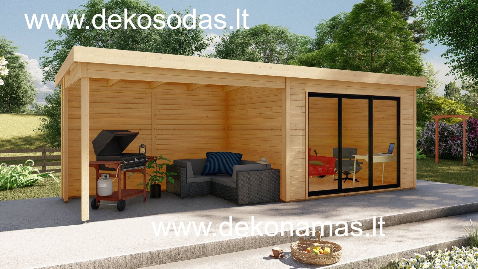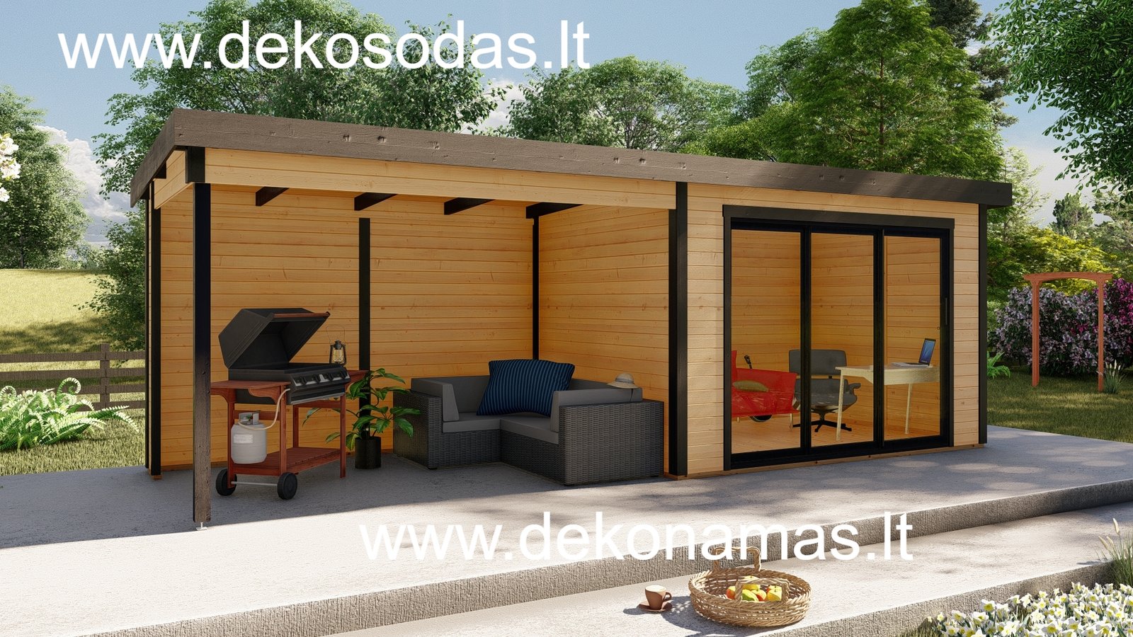 Medinis sodo namelis BORDO 360 × 240 + 360 cm su 28 mm sienojais, moderniomis aliuminėmis slankiojančiomis durimis ir didele stogine. Tinka poilsiui, darbui bei sandėliavimui. Galima versija su grindimis.