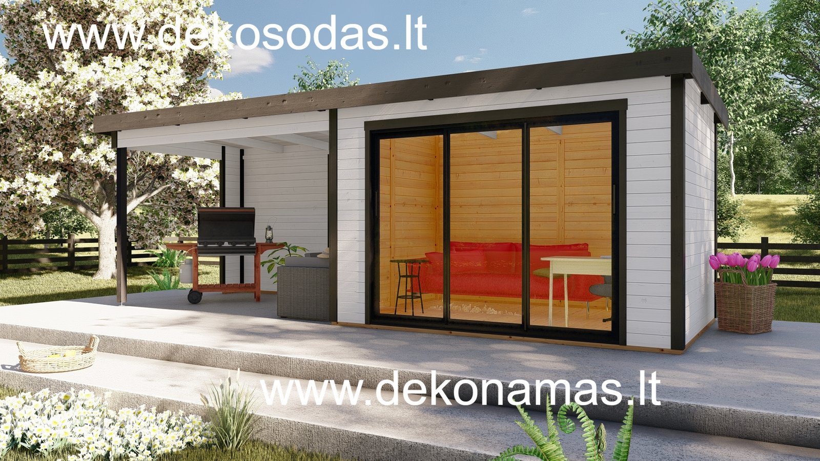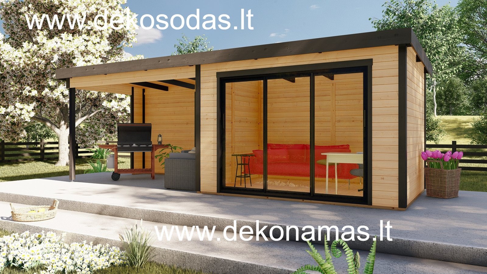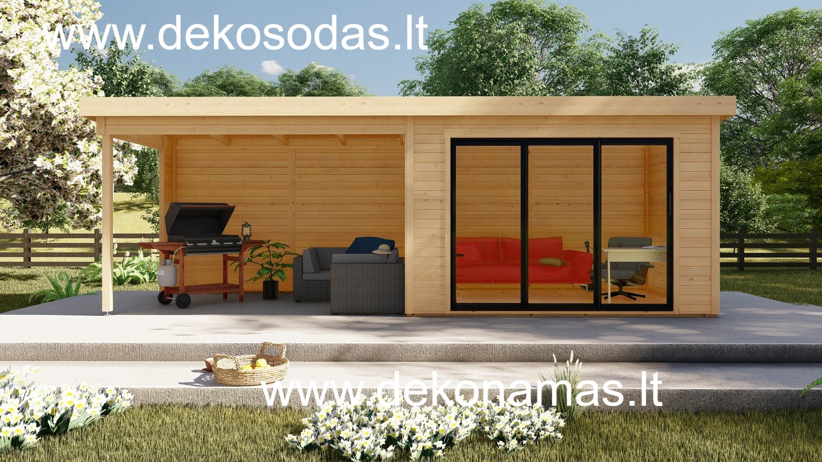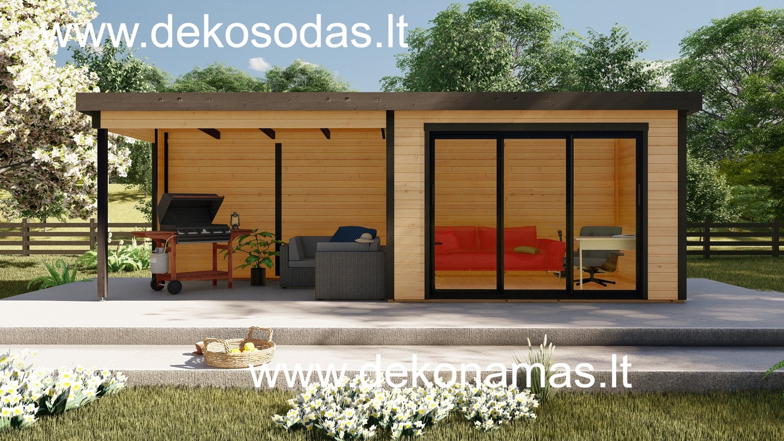 Medinis sodo namelis BORDO 360 × 240 + 360 cm su 28 mm sienojais, moderniomis aliuminėmis slankiojančiomis durimis ir didele stogine. Tinka poilsiui, darbui bei sandėliavimui. Galima versija su grindimis.
