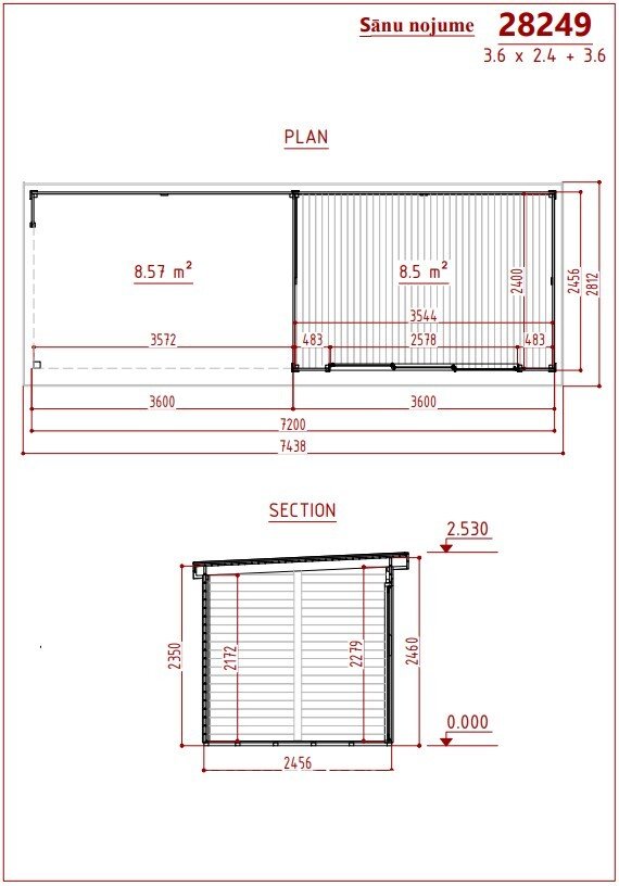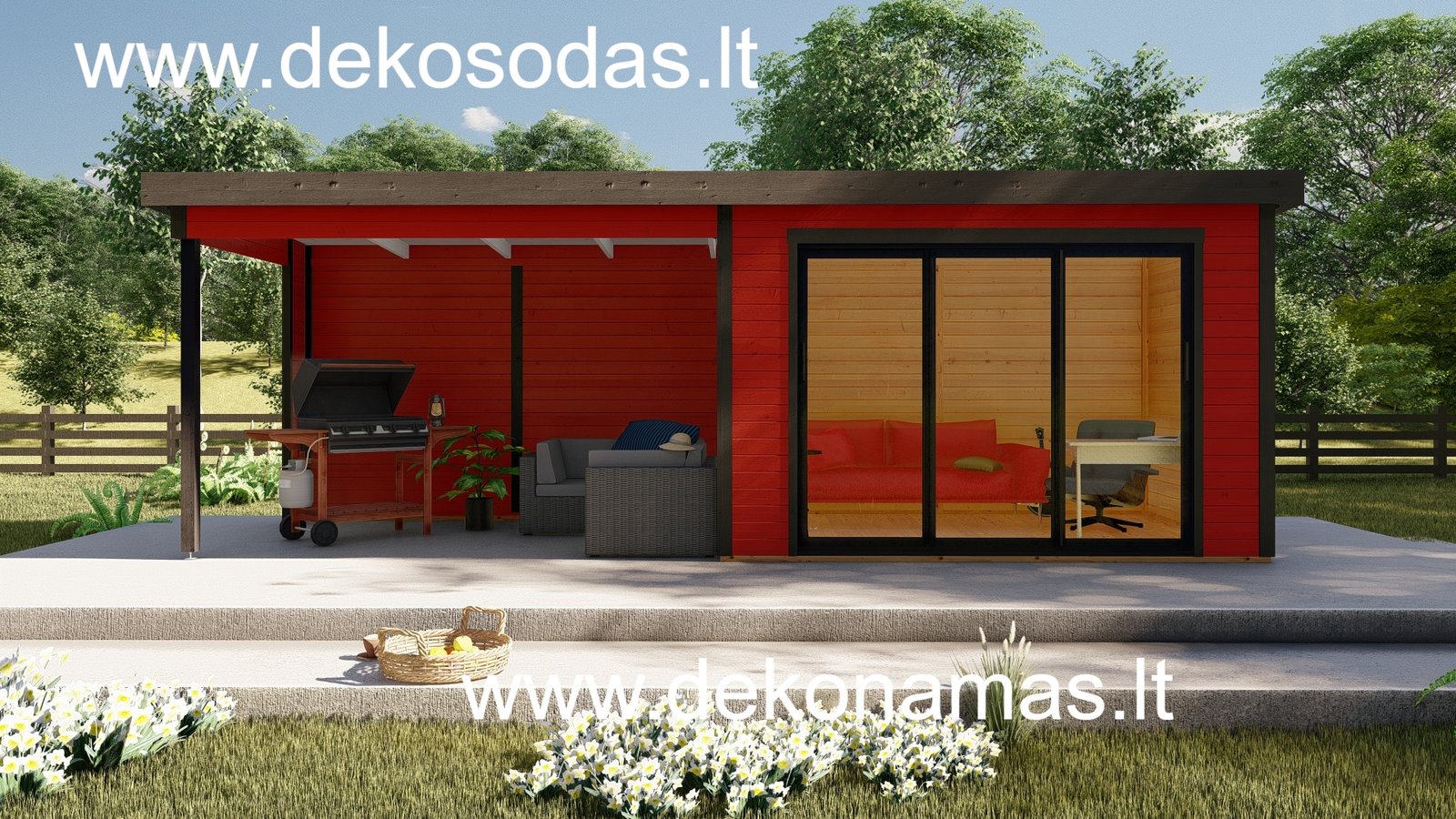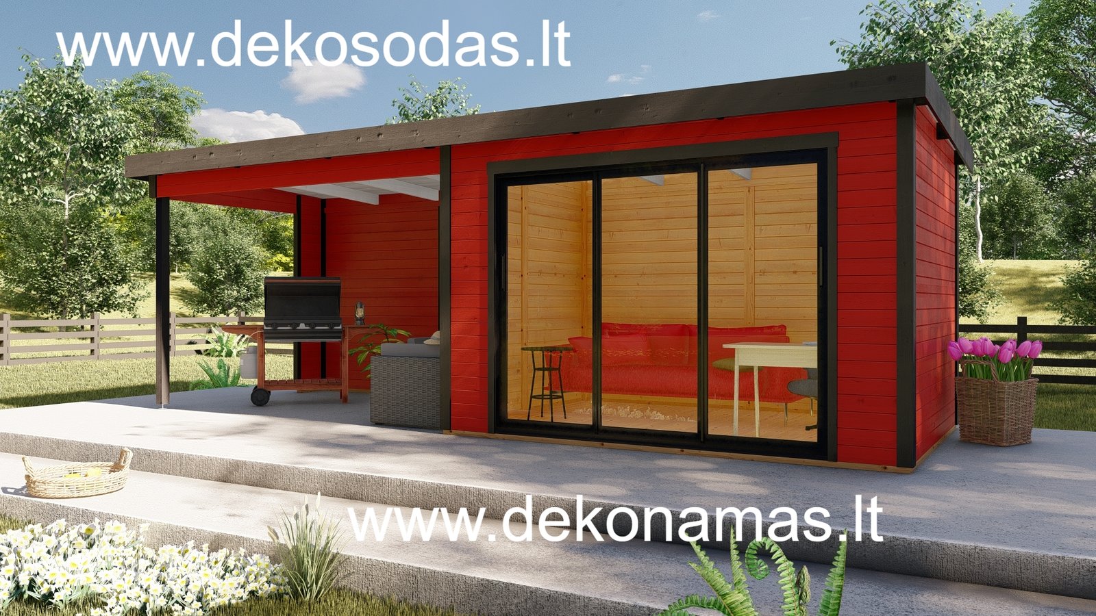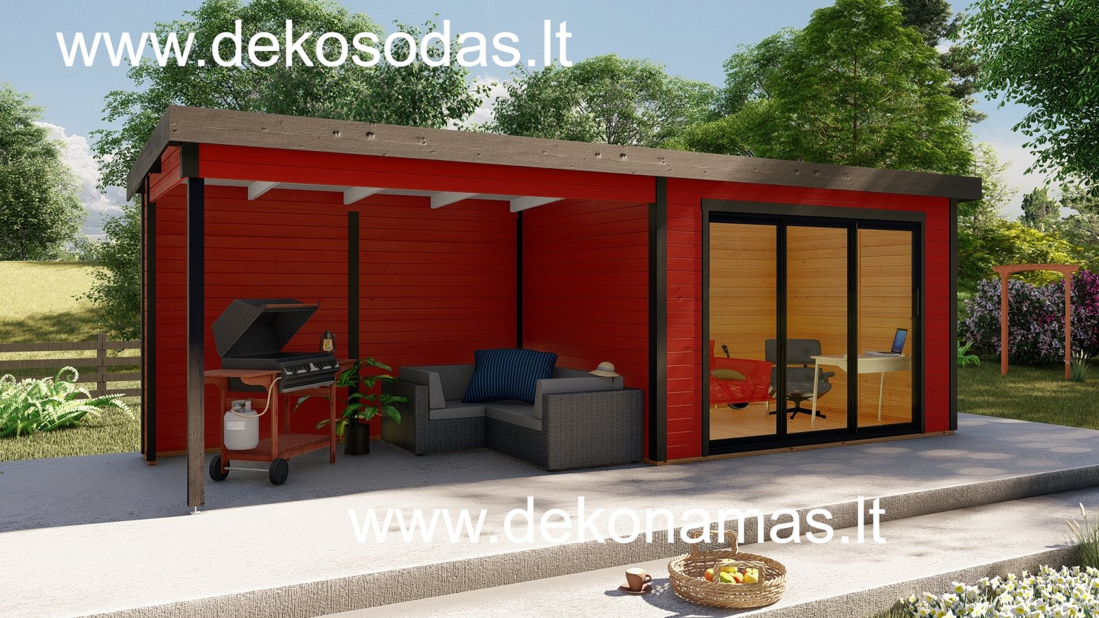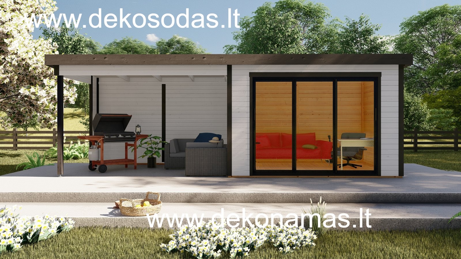 Medinis sodo namelis BORDO 360 × 240 + 360 cm su 28 mm sienojais, moderniomis aliuminėmis slankiojančiomis durimis ir didele stogine. Tinka poilsiui, darbui bei sandėliavimui. Galima versija su grindimis.
