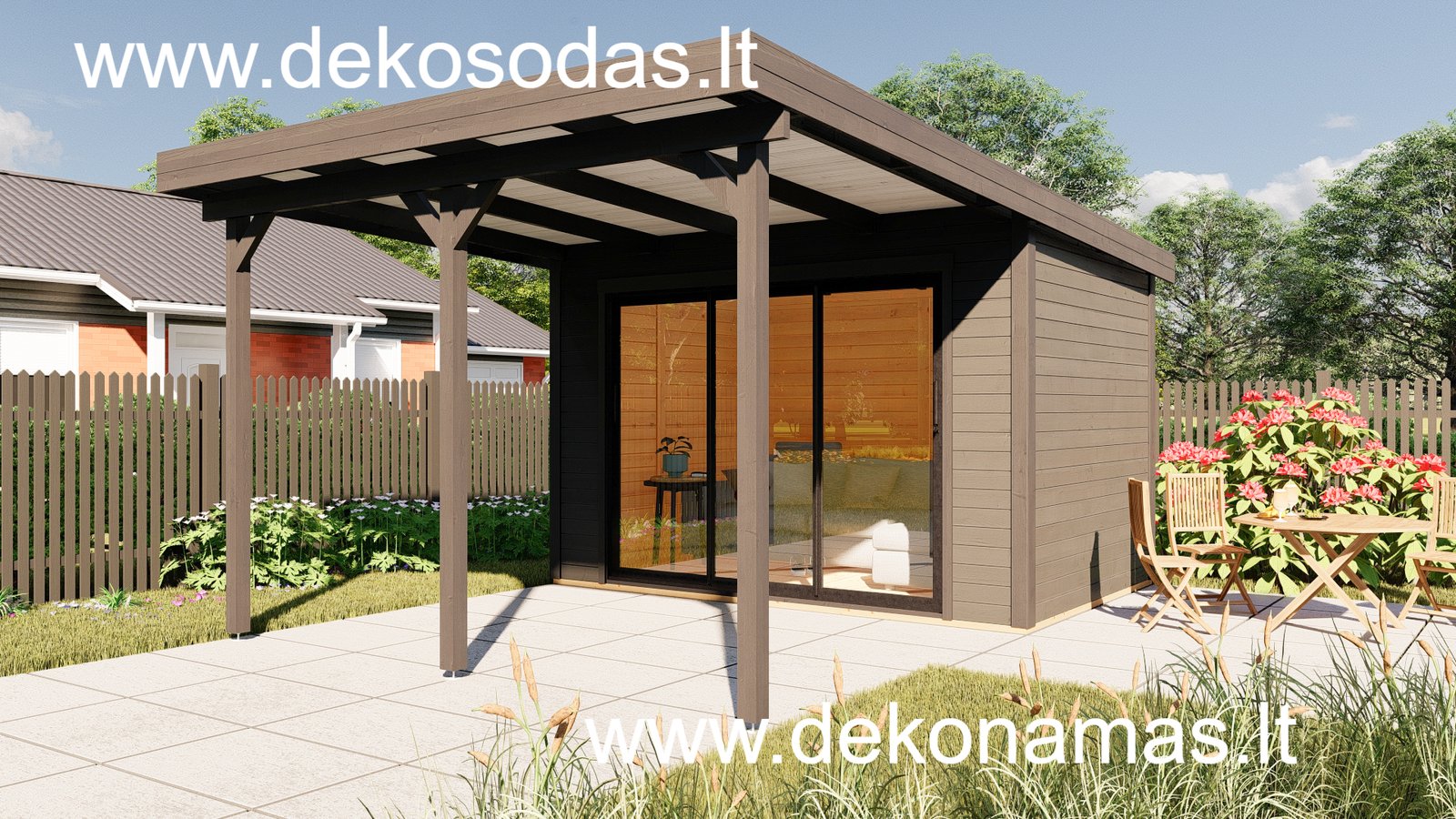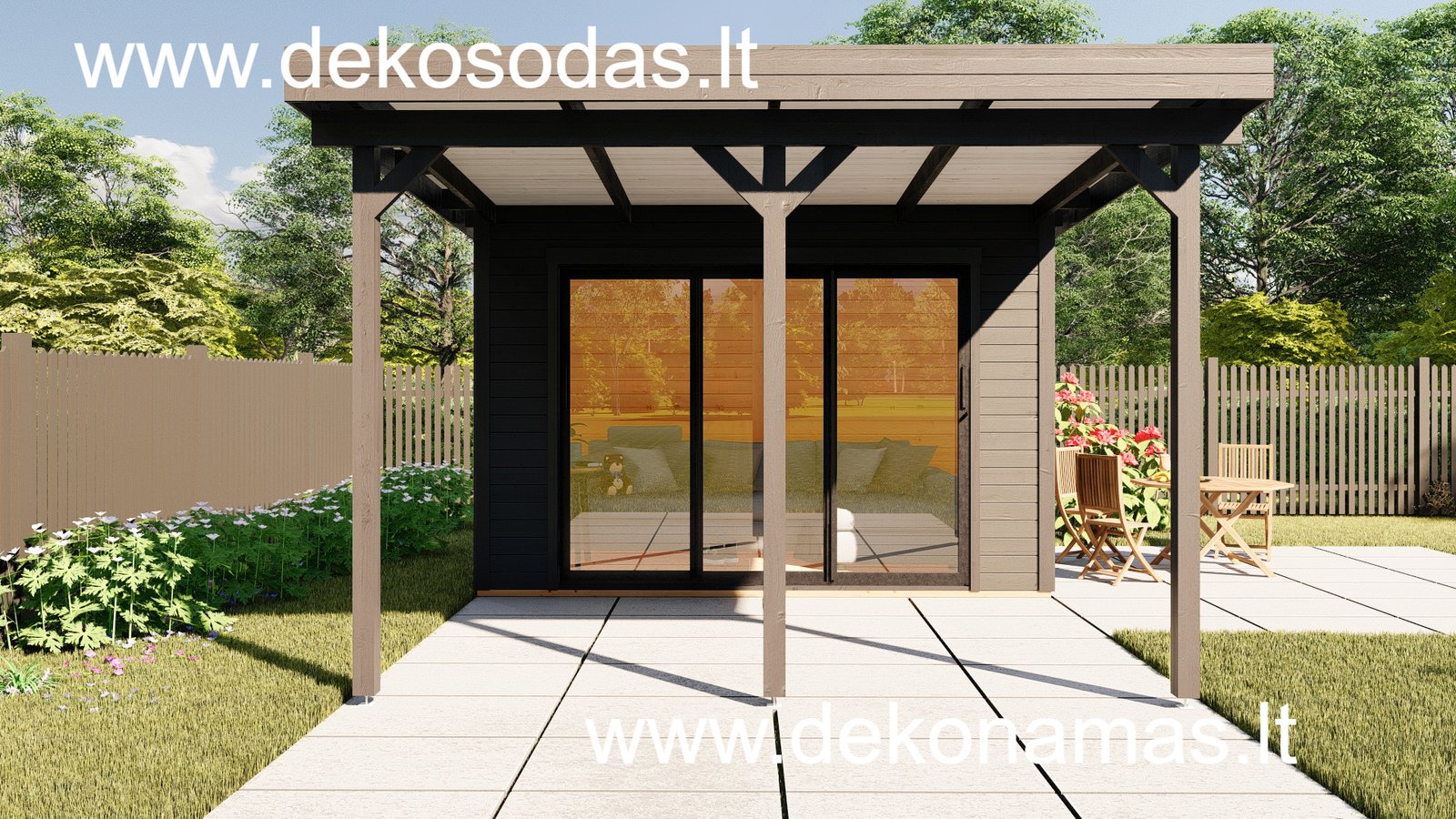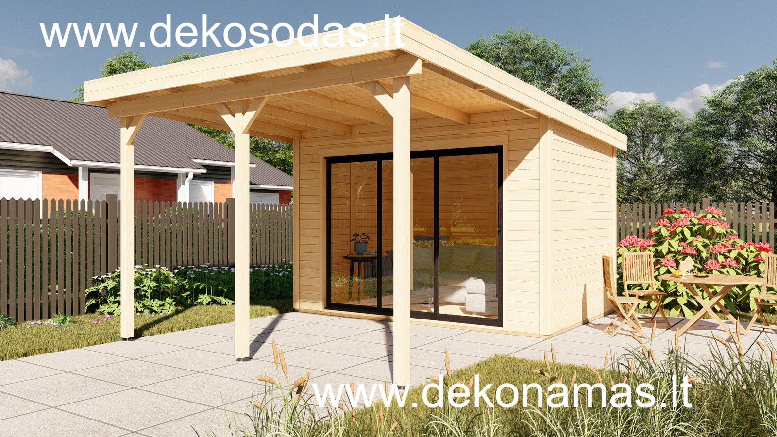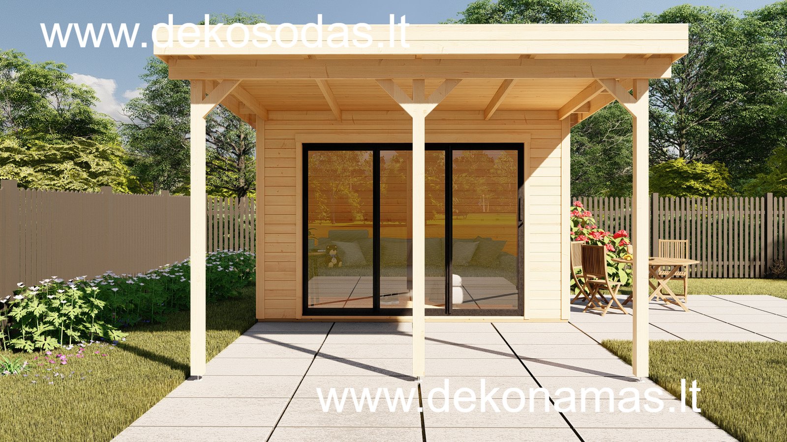Medinis sodo namelis LIFER 360 × 365 + 280 cm – tai modernus ir labai universalus sprendimas, jungiantis įstiklintą uždarą patalpą ir didelę stoginę, kuri gali būti naudojama kaip lauko pavėsinė, poilsio zona, vasaros svetainė ar sodo namelis. Toks išplanavimas leidžia mėgautis lauko erdvėmis nuo ankstyvo pavasario iki vėlyvo rudens.