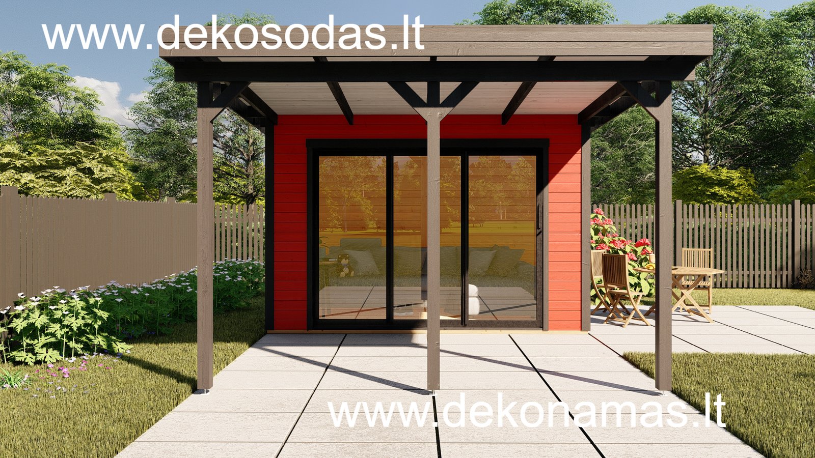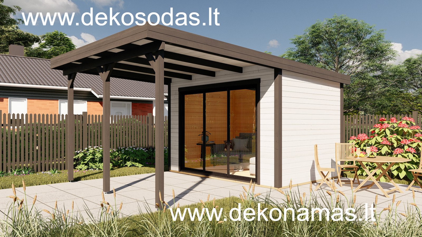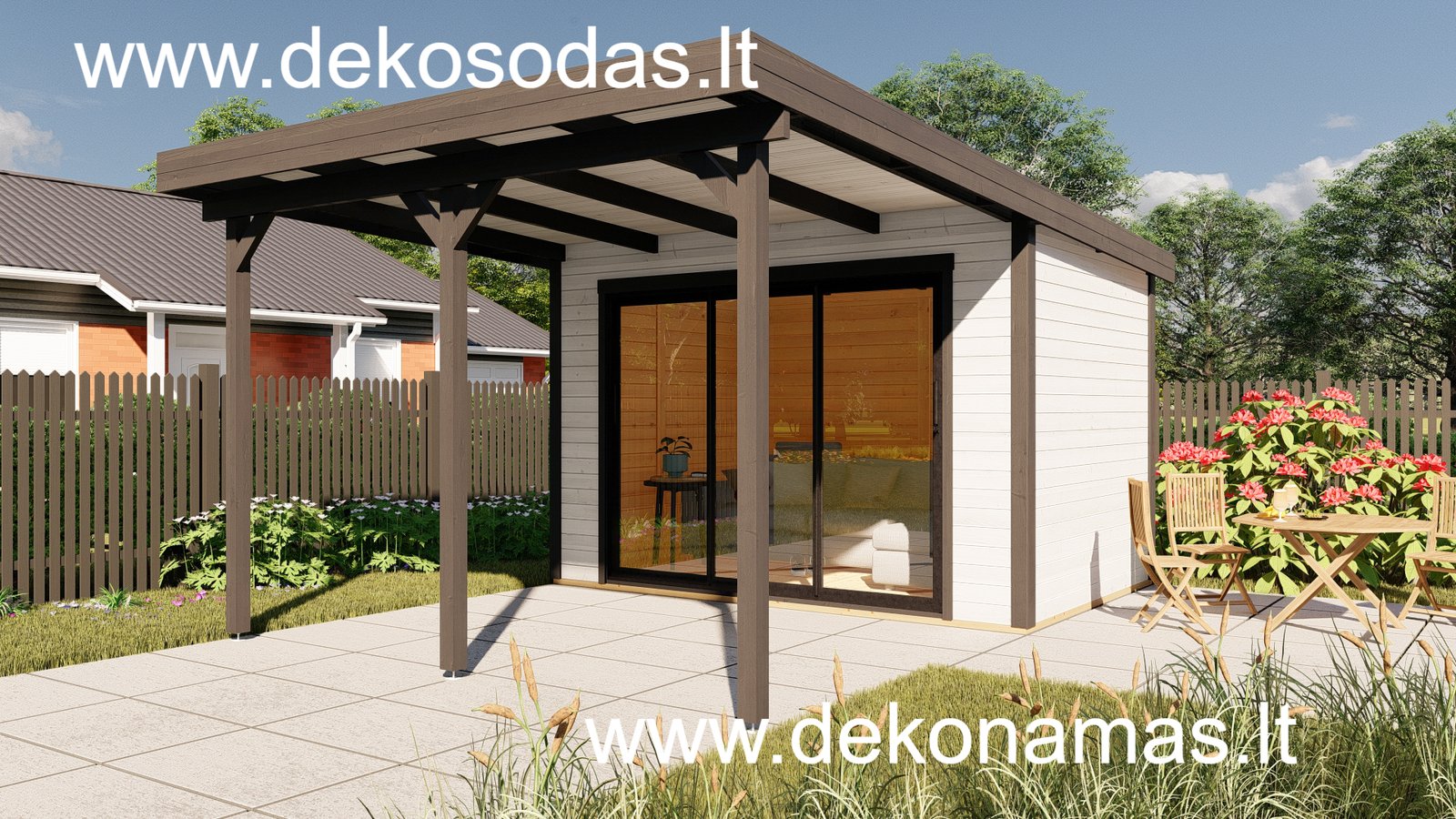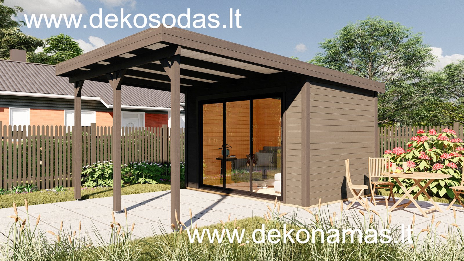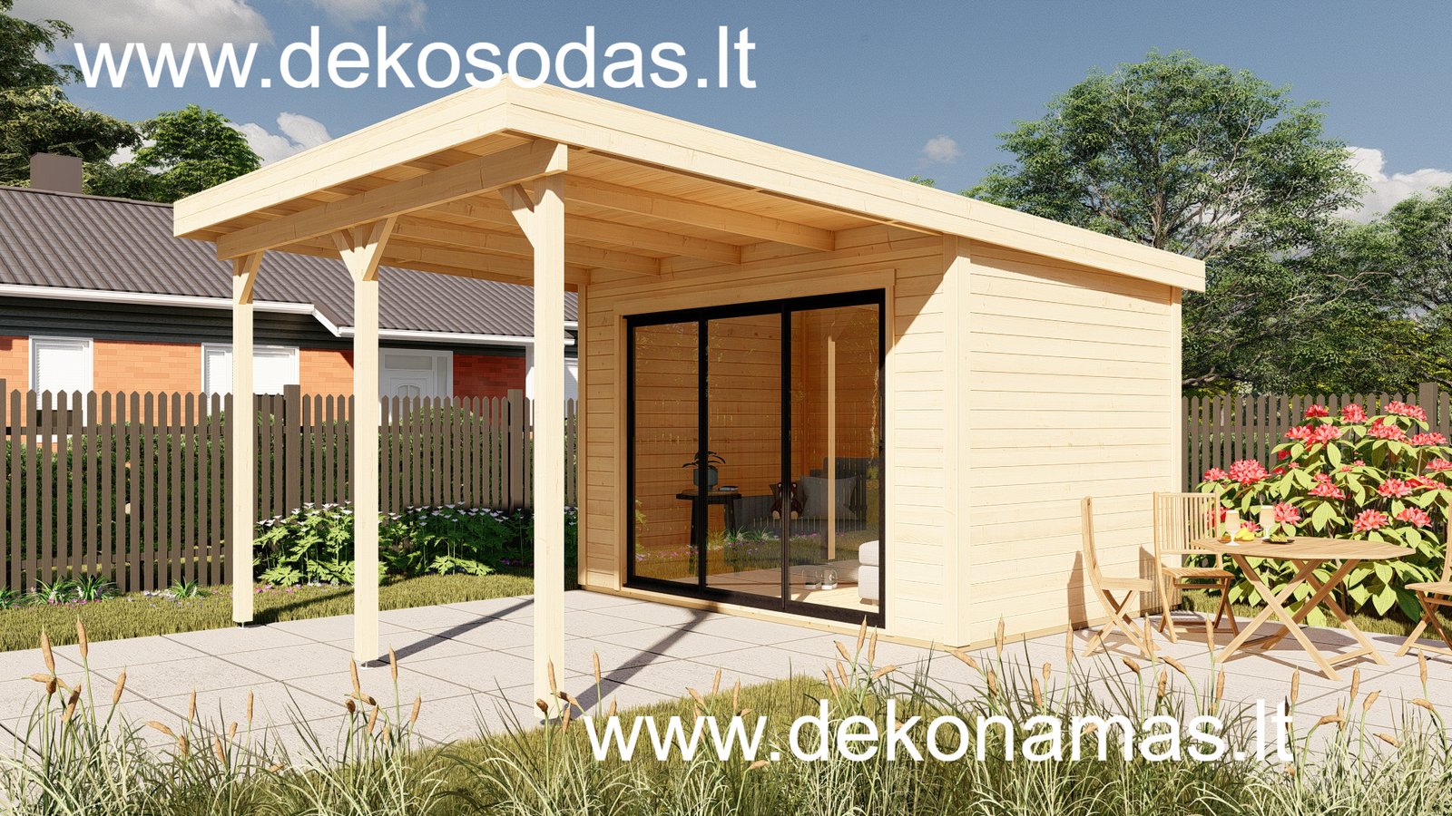 Medinis sodo namelis LIFER 360 × 365 + 280 cm – tai modernus ir labai universalus sprendimas, jungiantis įstiklintą uždarą patalpą ir didelę stoginę, kuri gali būti naudojama kaip lauko pavėsinė, poilsio zona, vasaros svetainė ar sodo namelis. Toks išplanavimas leidžia mėgautis lauko erdvėmis nuo ankstyvo pavasario iki vėlyvo rudens.