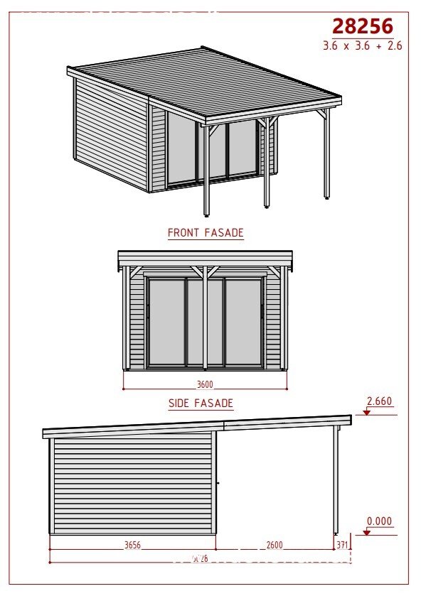 • Išoriniai sienų matmenys: 360 × 365 + 280 cm