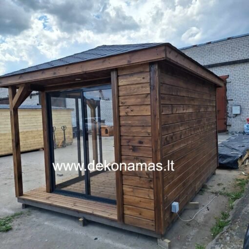 Keli panaudojimo būdai: Tai ne tik sodo namelis, bet ir medinis sandėliukas, kur galėsite laikyti įvairius įrankius ar kitus daiktus. Integruotas pavėsinis suteikia galimybę mėgautis grynu oru ir sukurti patogią lauko erdvę.