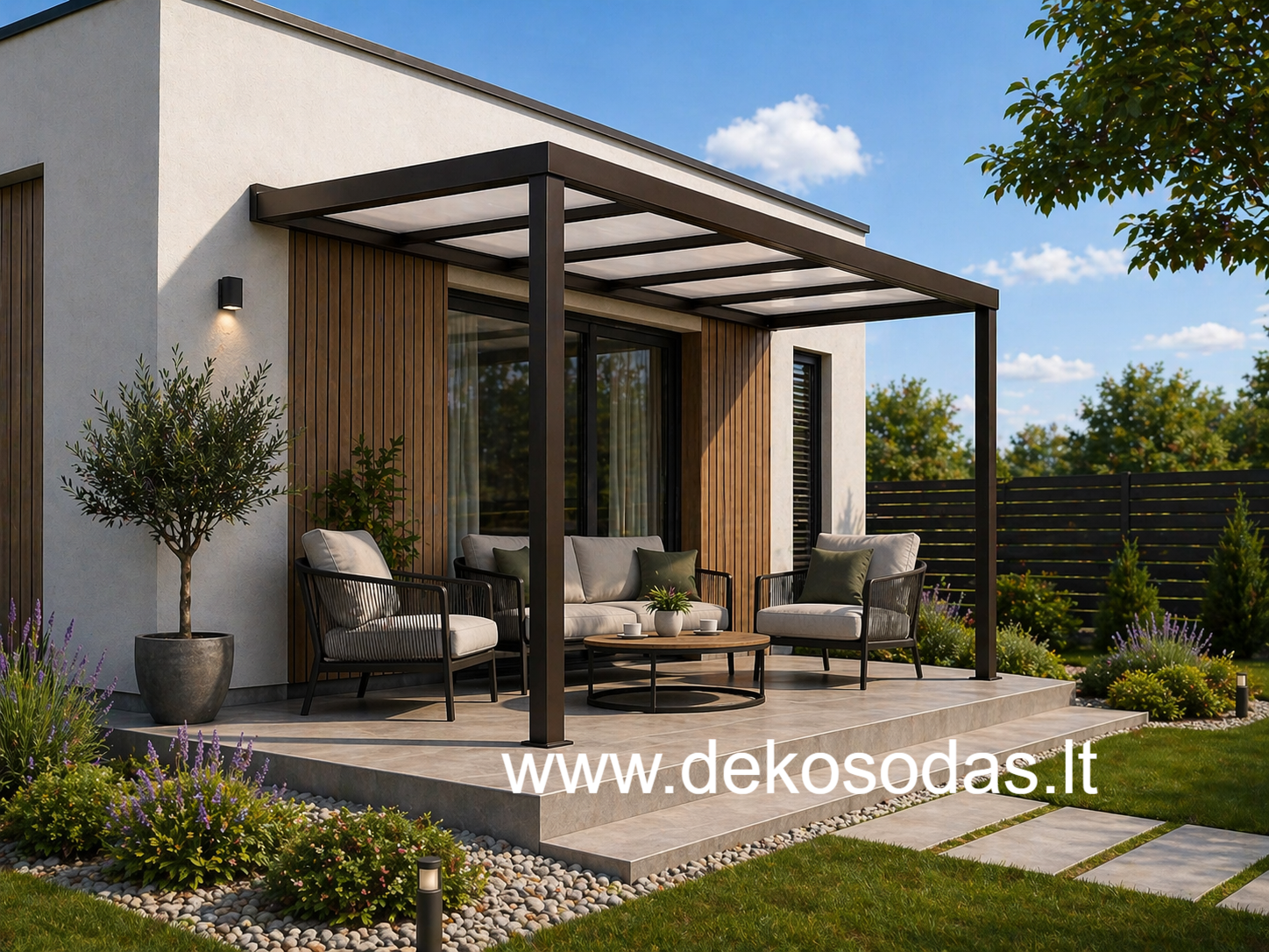 Konstrukcija pagaminta iš tvirto aliuminio profilio, kuris yra lengvas, nerūdija ir nereikalauja papildomos priežiūros. Stogas dengtas 16 mm storio baltu polikarbonatu – tai medžiaga, kuri praleidžia šviesą, tačiau apsaugo nuo lietaus, sniego ir tiesioginių saulės spindulių. Dėl nedidelio 3° nuolydžio vanduo efektyviai nubėga nuo stogo paviršiaus.