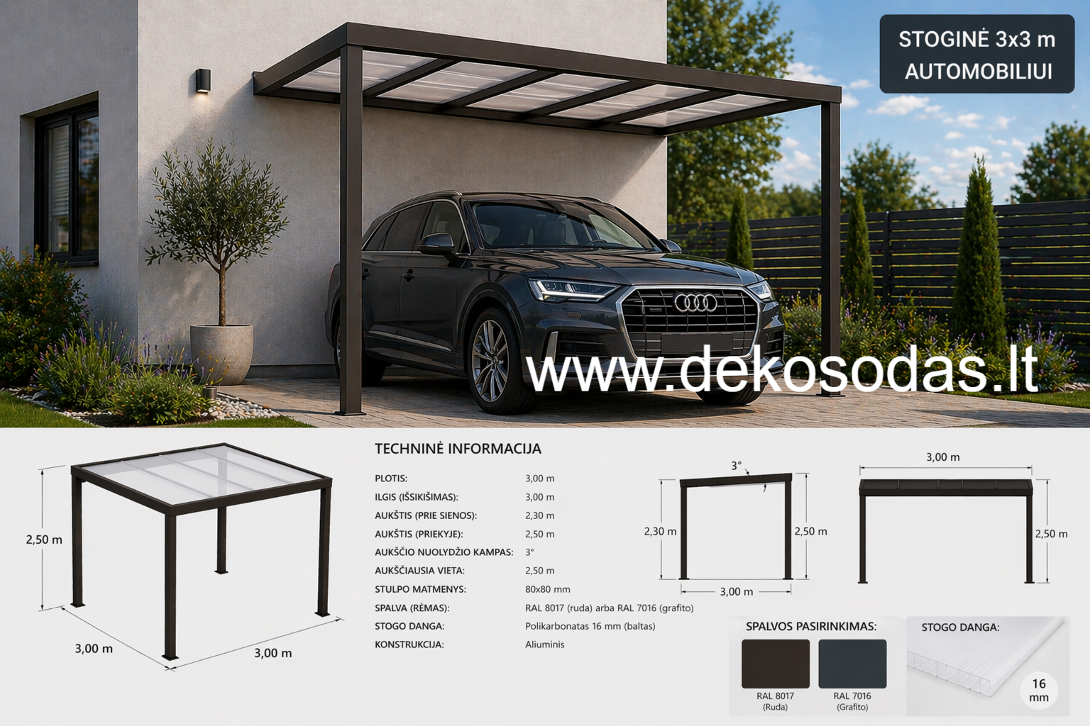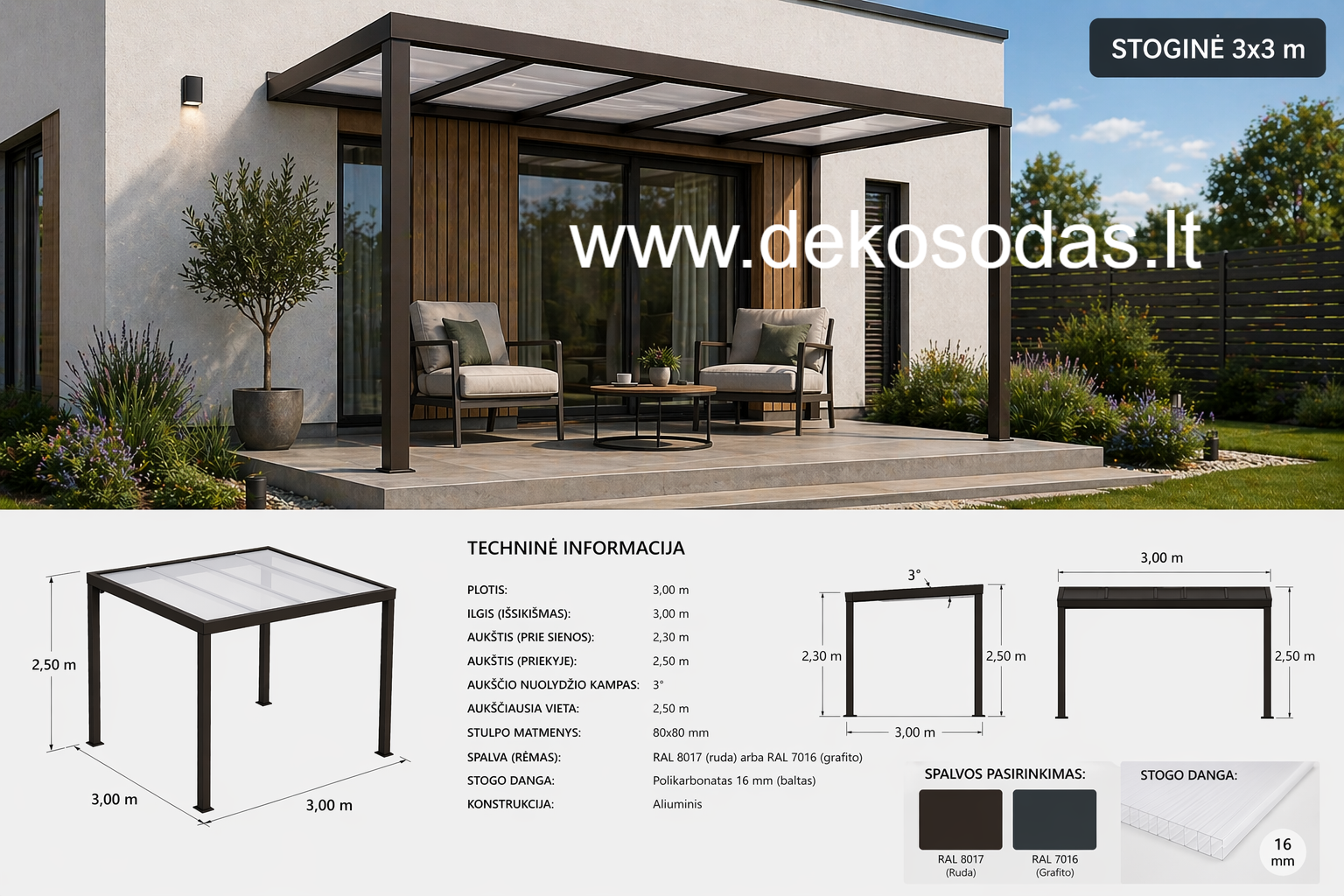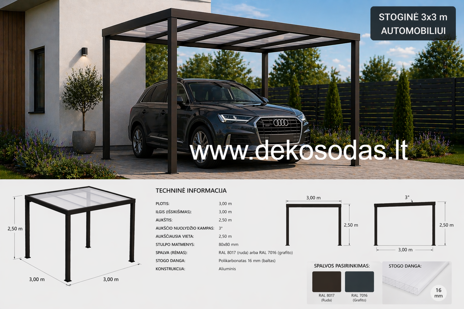 Ši 3×3 m aliuminio stoginė – tai funkcionalus ir estetiškas pasirinkimas ieškantiems ilgaamžio sprendimo savo kiemui, terasai ar automobilių pastogei. Minimalistinis dizainas puikiai dera tiek prie modernaus, tiek prie klasikinio namo fasado, o kokybiškos medžiagos užtikrina ilgaamžiškumą bei atsparumą Lietuvos klimato sąlygoms.