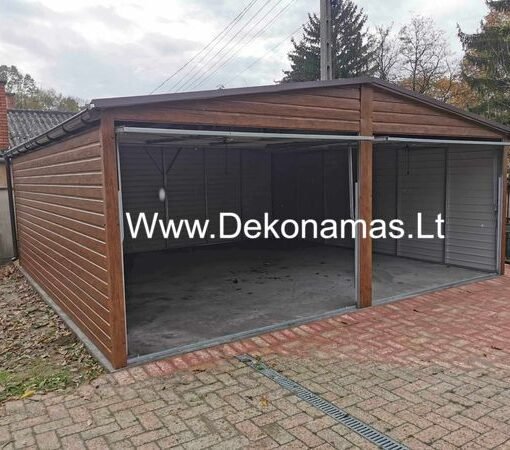 Auksinio Ąžuolo Medžio Imitacijos Paplatintas Dviejų Vartų Garažas su Pastoge (8x5 m)