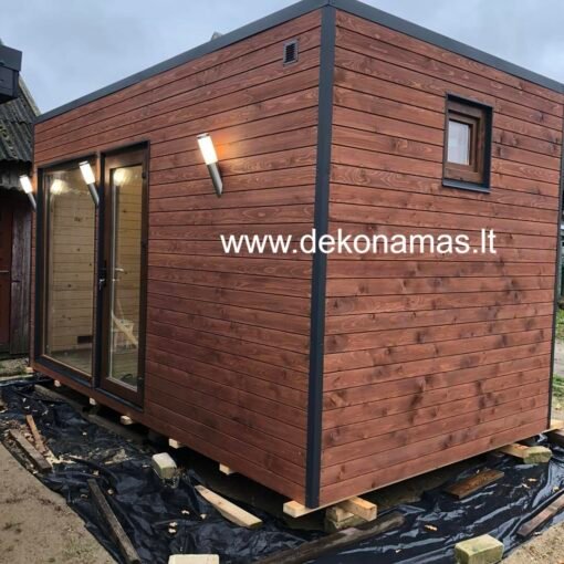 Medinė karkasinė pirtis 4.5×2.5 m su elektriniu pečiumi Harvia Cilindro 9kW, apšiltinta Paroc vata